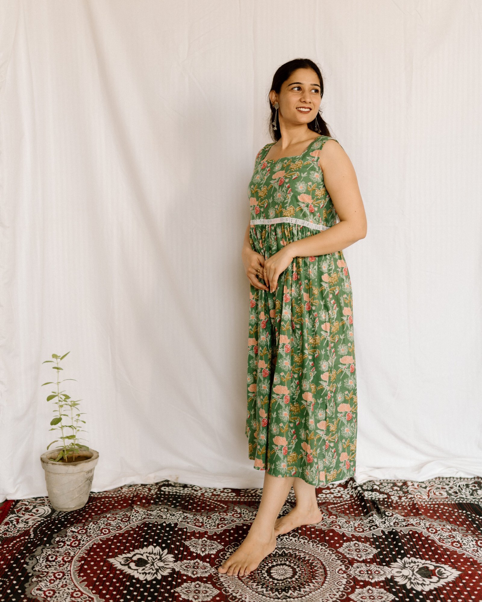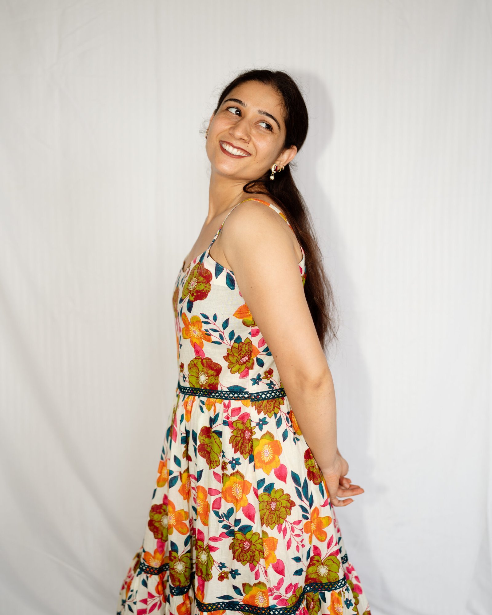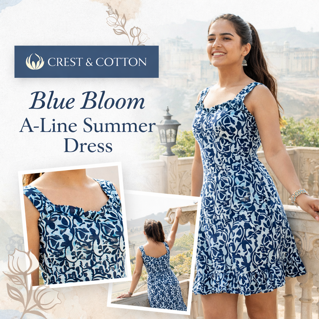 A soft cotton A-line dress featuring elegant blue floral prints and a relaxed silhouette. Perfect for brunch outings, vacations, and sunny afternoons. Designed for maximum comfort with a graceful feminine flow.