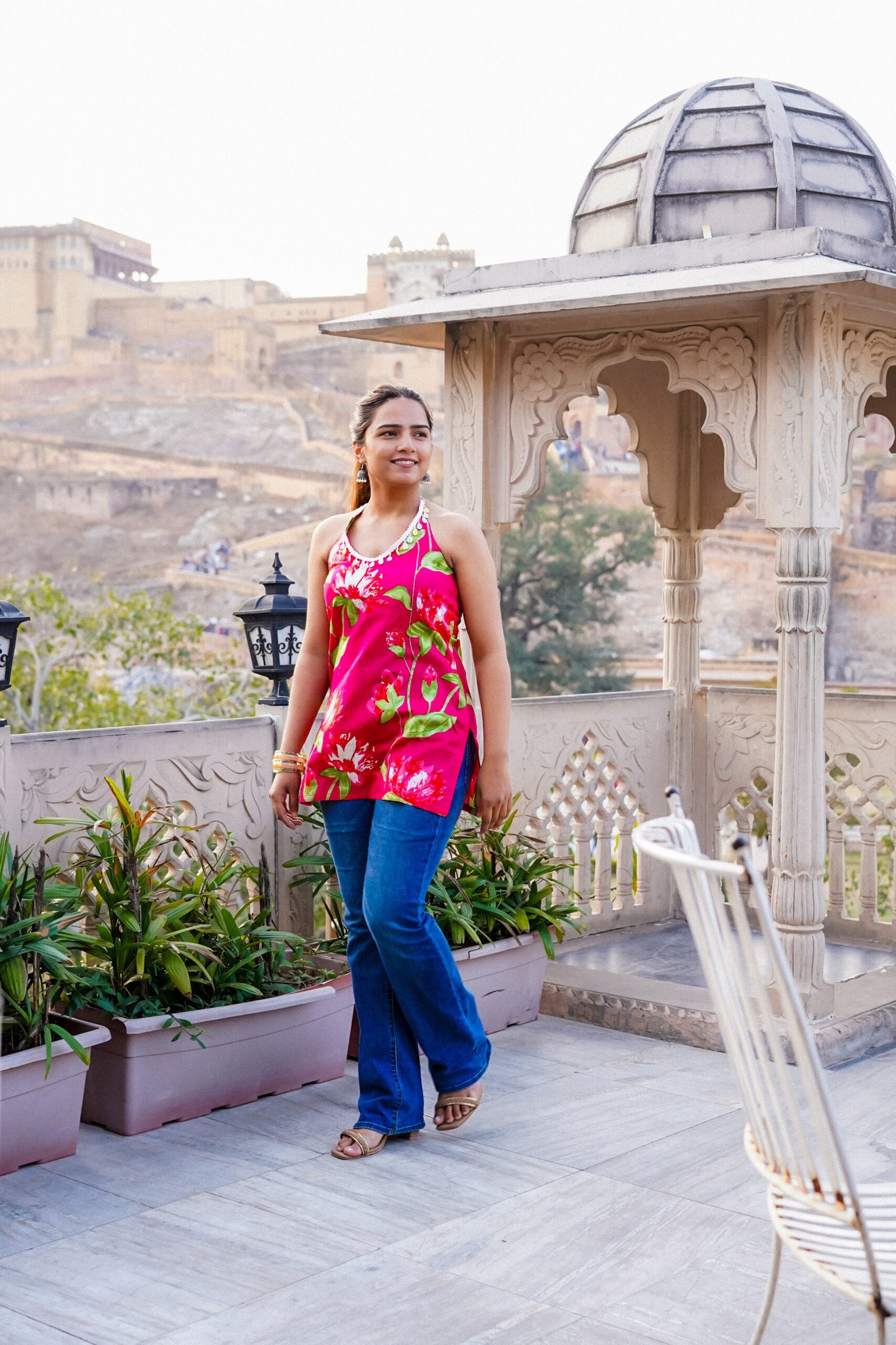 Add a vibrant pop to your wardrobe with our Pink Floral Halter Top. The breathable cotton fabric and playful floral pattern make it ideal for casual outings, summer days, and travel styling.